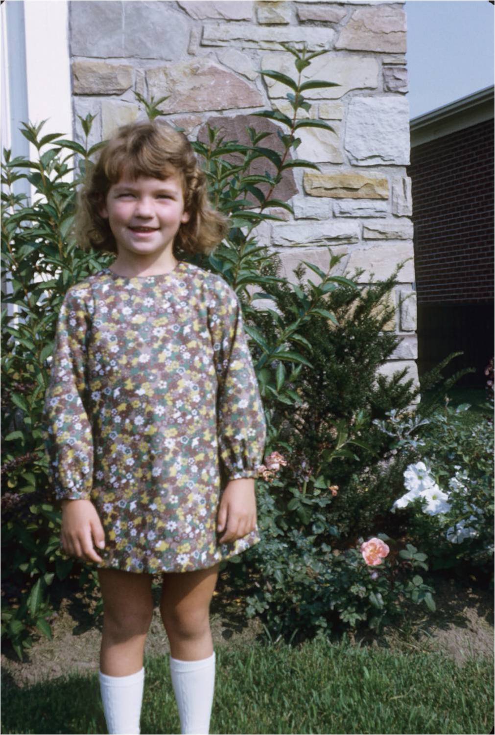 Portrait of the Writer As A Young Girl ← Previous Next → Portrait of the Writer As a Young Girl Jane as a young girl standing in front of a garden in a flowered dress and white knee socks.